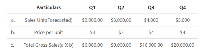 Example: Paper Limited plans to produce pack of assorted color papers in the upcoming year ending in 2020. They forecast the sales to be $2,000 in quarter 1, $3,000 in quarter 2, $4,000 in quarter 3 and $5,000 in quarter 4. They estimate the selling price for the first two quarters to be $3 which is expected to be increased to $4 in quarter 3 and quarter 4 by the sales team.