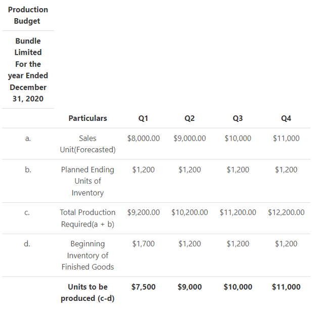 Example: Bundle Ltd plans to produce packs of dry gel pens in the upcoming year ending in 2020. It estimates the sales to be $8000 in quarter 1, $9,000 in quarter 2, $10,000 in quarter 3 and $11,000 in quarter 4. The planned ending inventory is forecasted to be $1200 at the end of each quarter, which in the beginning was $1700.