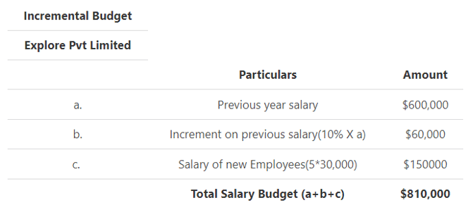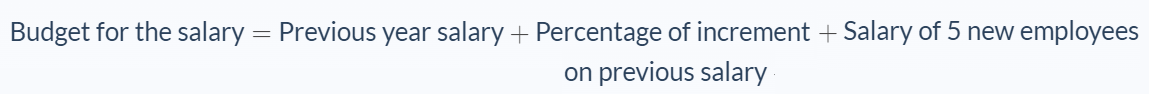 Example: Explore Pvt Limited must develop the budget for the 2020-21 for the salary of its employees. They plan to hire 5 new employees and pay each $30,000 during the next year. They also decide to give an increment to the existing employees of 10% as the company has been able to generate quality business deals.