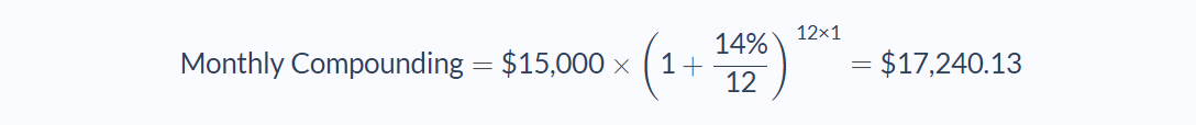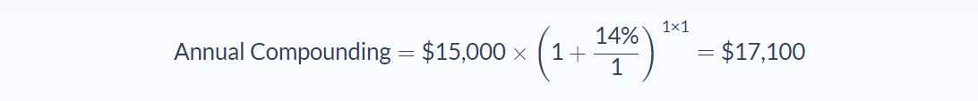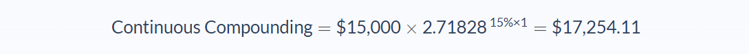 Jeremy is looking at investment opportunities and has $15,000 to invest, with an expected interest of 14% over the next year. We can use the finite and continuous compounding formulas above to find the ending value of the investment: