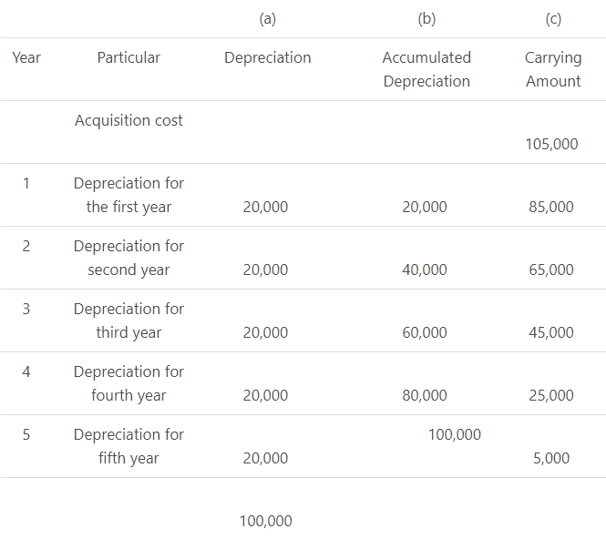 - Acquisition cost of P105,000 minus column (b). Thus, at the end of the first year, P105,000 minus accumulated depreciation balance of P20,000 equals P85,000; at the end of the second year, P105,000 minus P40,000 equals P54,000, and so on.
