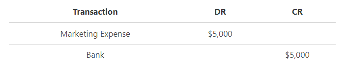 As shown in the tables above, when the company incurs a marketing expense, the expense is increasing. Hence the T account of marketing expense is debited with $5,000. Similarly, the opposing entry of Bank which is an asset is credited with $5,000.