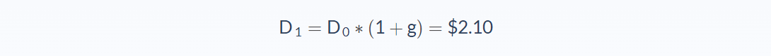 Let’s start by calculating the dividend for next year (D1). We know that the current year’s dividend (D0) is $2 and the expected dividend growth rate (g) is 5%.