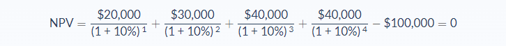 So, for example, if your cash flow was one period, for $105, and the initial investment was $100, then to get an NPV of $0 you would need an interest/discount rate of 5%. That is your internal rate of return.