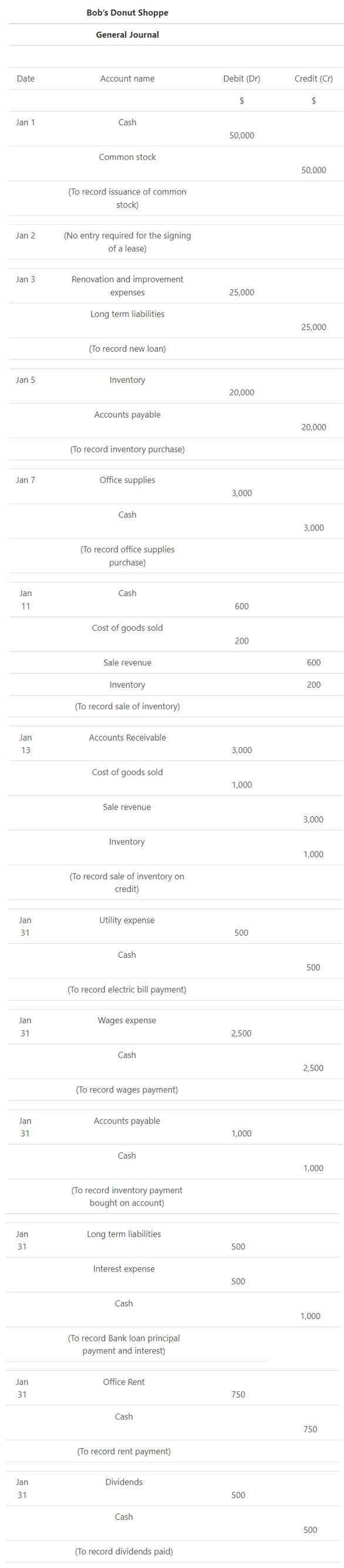 - Jan 1. Bob forms the Donut Shoppe, Inc by purchasing 50,000 shares at $1 per share.
