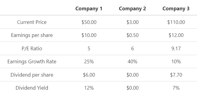 For this example let’s assume that you want to compare 3 stocks to determine which if any would be a good investment at their current price. Below is the breakdown of the three companies. Company 1 is a company that has been around for 7 years and is now starting to be considered a mature company.