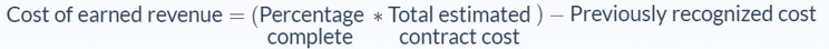 Finally, we calculate the cost of earned revenue in the same manner. This means multiplying the percentage of completion by the total estimated contract cost and subtracting the previously recognized cost to arrive at the cost of earned revenue for the present accounting period.