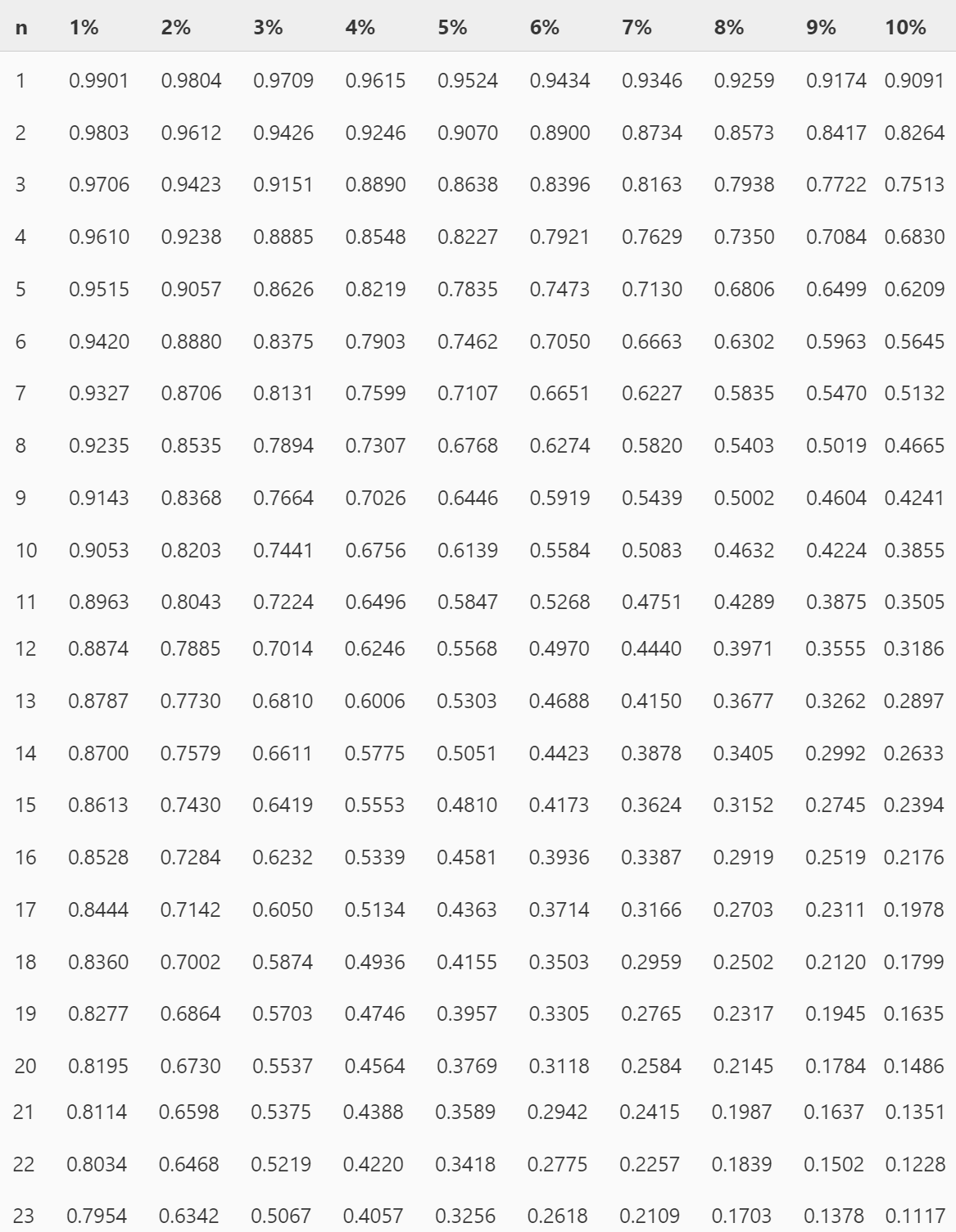 A present value of $1 table is very useful for listing the discount rates that are used for a variety of interest rate (i) and time period (n) combinations. This is also known as a present value interest factor (PVIF).