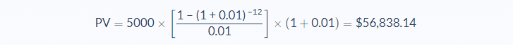 Mrs. Danielson is taking out a business loan requiring payments of $5000 at the beginning of each month for 12 months. The annual loan rate is 12%. Calculate the present value of the annuity due.
