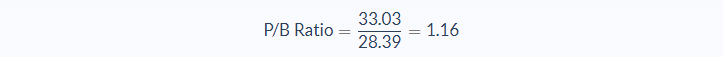 Robin is considering purchasing a stock for a burger place she loves. But first, she wants to know if it would be a sound investment. She looks up their stock analysis and learns that their price per share is $33.03. The book value per share is $28.39. What would be the company’s price to book ratio?