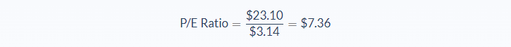 In this example, assume a fictional bank has shares valued at $23.10, while the earnings per share sat at $3.14. Using the P/E ratio, one can determine that the company was trading at about 7 times their earnings.