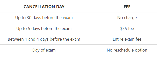 A $35 fee is assessed for rescheduling between 1 and 5 days prior to your appointment, and the entire exam fee is charged if you cancel or do not show up for your appointment on the scheduled test date.