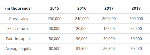 Net sales can be calculated by subtracting sales returns from gross sales. The average shareholders’ equity is found by summing up the beginning and ending equity and then dividing by 2.