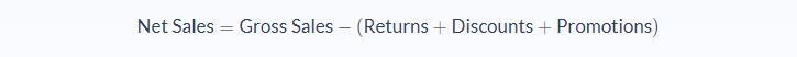 The net sales is the revenue generated after accounting for returns, discounts, promos, and interests during sales. So the net sales is given as the difference between the gross sales and the sum of returns, discounts, promos and interests.