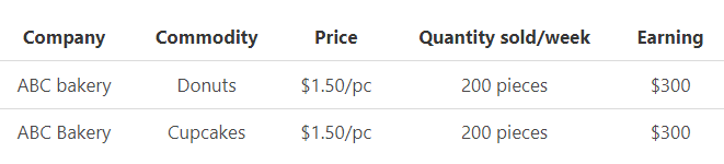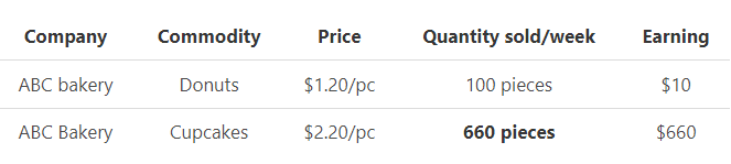 Example 2: ABC bakery sells donuts to its consumers at $1.50 each and cupcakes at $2 each. At this rate, the bakery can sell 200 pieces each of cupcakes and donuts earning them $300 for the week.