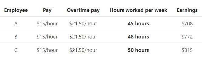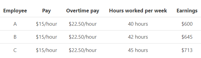 Example 3: A furniture company pays $15 per hour to their employees for a 40-hour workweek and pays overtime of $22.50 per hour.