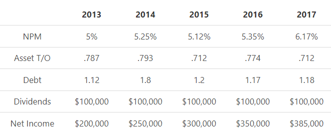 DuPont Analysis focuses on the combined effect of profitability and turnover ratios. By modifying the approach a bit, it is possible to estimate a company’s sustainable growth. Simply, sustainable growth would be the realistic attainable growth that a company could maintain without running into problems.
