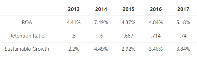 The return on equity, retention ratio and sustainable growth measures for the years in the previous example would be:
