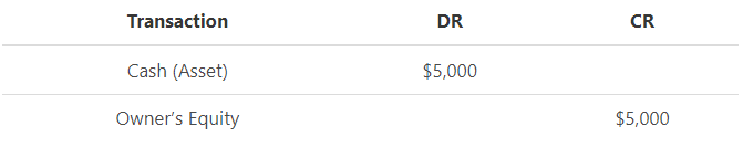 - John sets up a business with $5,000 in cash. The transaction will be recorded as follows