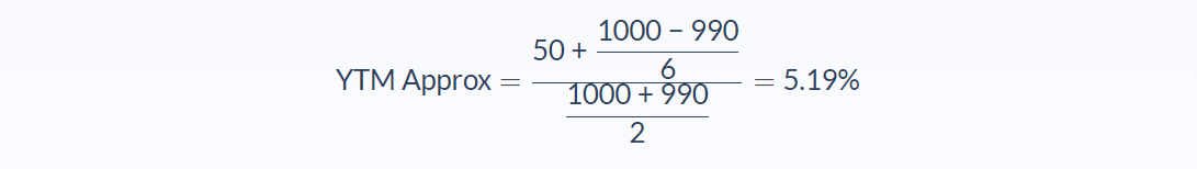 An example shows the approximate yield to maturity for a 5%, $1000 bond selling for $990 with 6 years to maturity.
