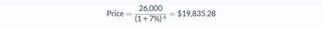If Edward decides to buy the bond today, he will pay 19,835.28, which is 76.29% of the Face Value. When the bond matures, he will earn $6,164.73 for an annual interest rate of 7%.